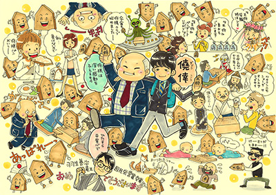 2017年に話題となった加藤一二三さんと藤井聡太さんが中心となっています。可愛らしくデフォルメされた駒や、将棋に夢中になる人々が、明るくぎゅっと凝縮されており、見ていて楽しい気持ちになります。