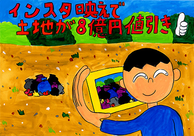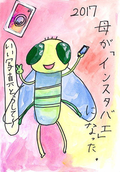 「インスタ映え」と虫の「ハエ」をかけた作品です。何でも写真に収めようとする現代人への風刺が効いています。