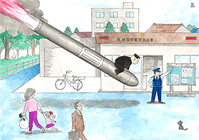 ほんわかとしたタッチでありながら、何とも風刺の利いた作品です。飛んできたミサイルに道を尋ねられて「あっちだよ」と教える警察官に「間が抜けている!」と審査員から苦笑が漏れていました。