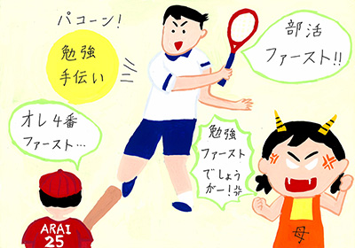 「勉強」と「手伝い」をテニスラケットで打ち返す元気の良さ!ジュニアらしいアクティブなアイデアにあふれています。自分にとっては「部活」が一番!そんな我が子に「勉強もしなさい!」とお怒りモードの母親も、まんが的な表現が用いられており、いい味を出しています。
