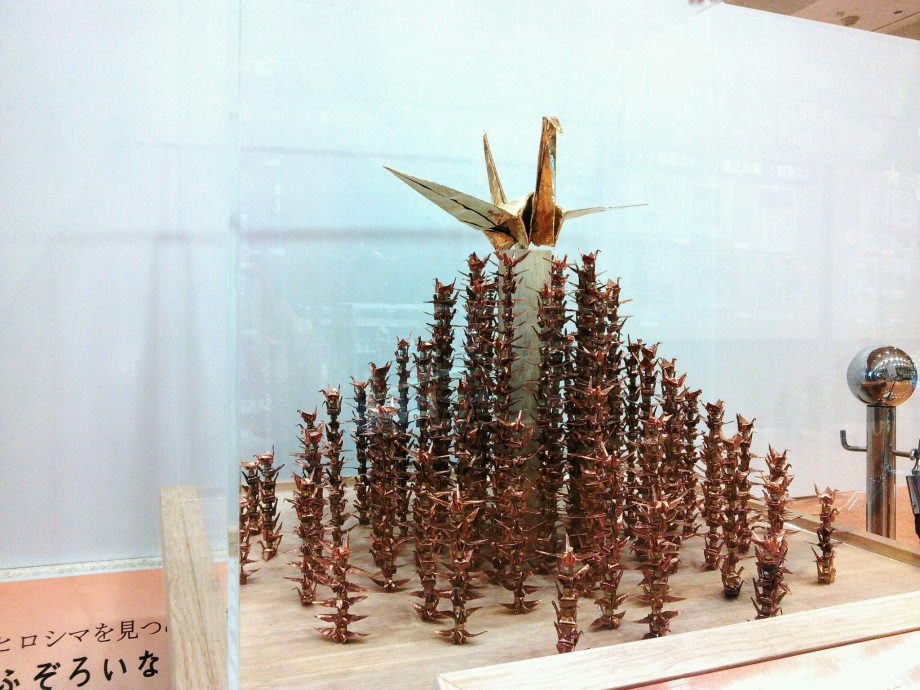 広島市立広島工業高等学校では、平成17年度から機械科3年生の授業の一環として「銅板折り鶴」を製作しています。被爆70周年にあたる平成27年には、平和を願う「ヒロシマの心」を伝え核兵器廃絶を目指すことを目的に、2年がかりで千羽鶴にされました。この「銅板千羽鶴」に込めた平和への願いを、広く市民の皆さんや広島を訪れる方々にも共有してもらいたいと、『はだしのゲン』の作者中沢啓治氏の命日である平成27年12月19日、中央図書館にご寄贈いただきました。3階広島資料室前に展示しております。鶴の一羽一羽に込められた高校生の平和を願う思いを感じとってください。
